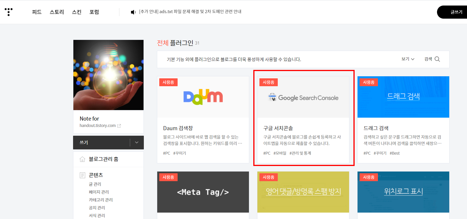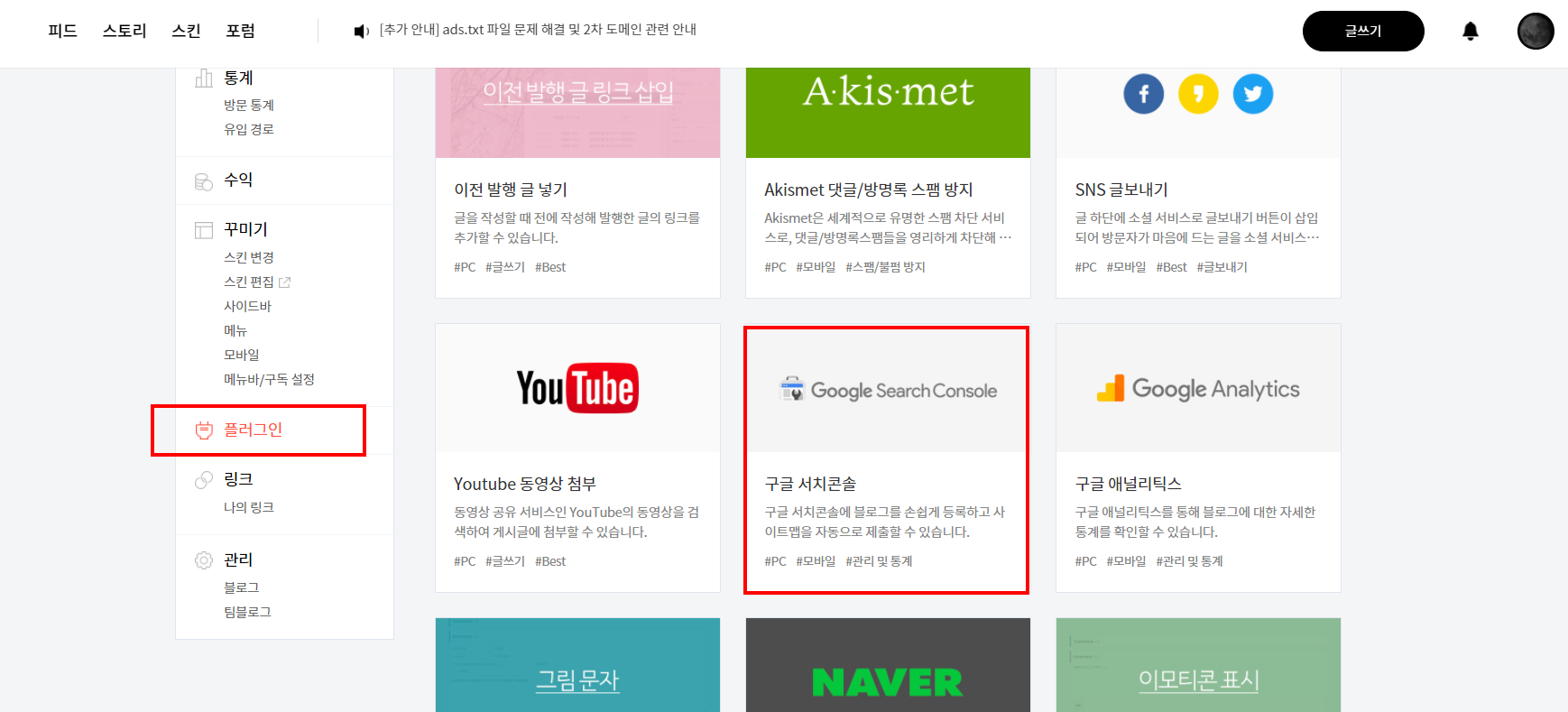 Step1 : 티스토리 관리 > 플로그인 > 구글 서치콘솔