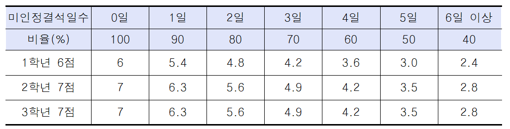 나. 학년별 출결 상황의 내신점수 산출표