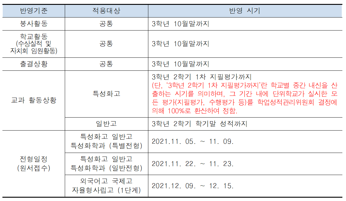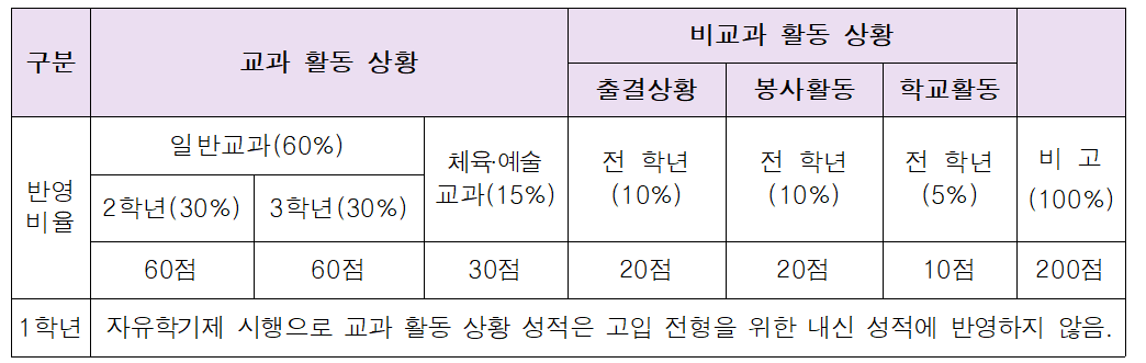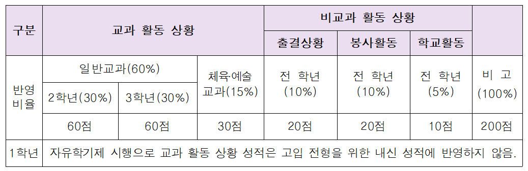 ※ 학교활동 실적 점수 10점과는별도로 내신 총점 200점 범위 내에서 해당 특성화고등학교장이 가산점을 부여할 수 있다.