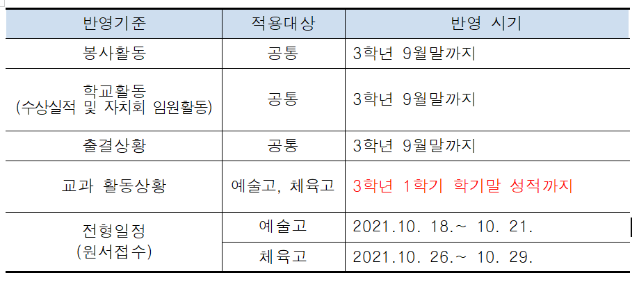 다.모든 학생의 수상실적은 졸업생, 재학생 구분 없이 교내상만 실적으로 인정하며 인정점수는 한 개의 실적에 0.5점 가산점을 부여하고, 학교 교육과정 내에서 활동한 자치회 임원활동 점수는3학년 10월말까지월 0.1점씩을 부여한다.(자치회임원활동 시작 후 월 15일 이상은 1개월로 인정한다.)