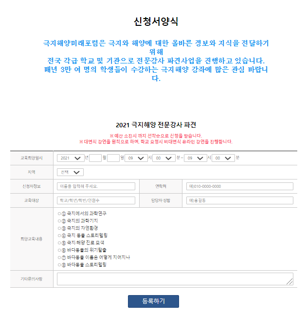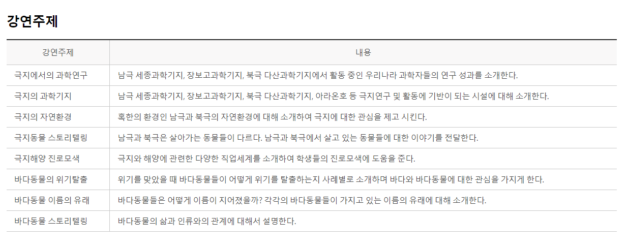 극지 전문가의 강연을 듣고 싶다면? 교육 2021.06.07 댓글 handout 극지 전문가가 일선 학교로 파견되어 강의를 해주는 교육 기회가 있다는 것을 알고 있나요? 극지해양미래포럼 웹사이트 http://pof21.com 에서 신청 가능하다. 교육 신청을 클릭하고 신청을 하면 된다. 공유하기 게시글 관리 Note for 저작자표시 비영리 변경금지 (새창열림) 교육 카테고리의 다른 글 [학교&교육] 교육자료 플랫폼, 잇다 2022.02.21 과학추천 도서_과학창의재단 2021.06.29 학생 주도성 프로젝트 활동의 운영 목적과 추진 방향 2021.06.02 2022 고입 내신 성적 반영 지침 및 주요 변경 사항(요약) 2021.04.18 댓글보기