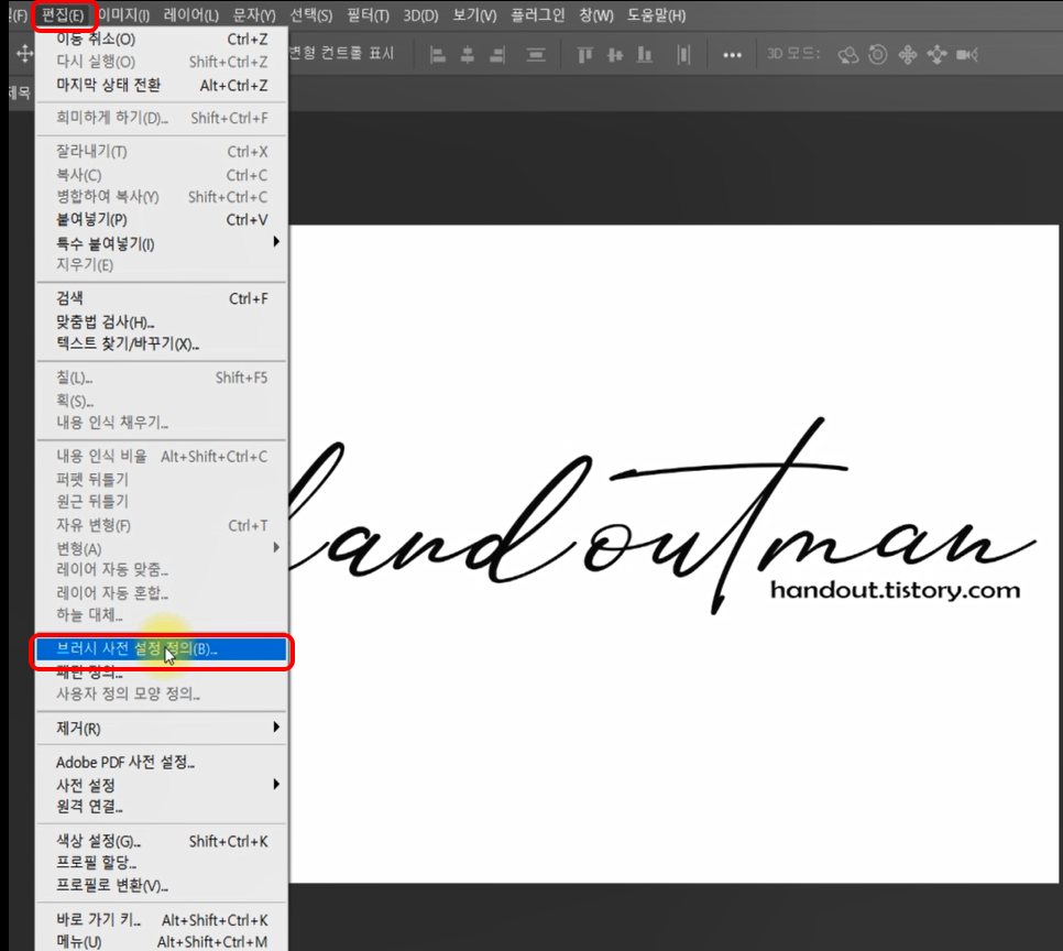 지난 시간에 포토샵 체험판에서 자신만의 시그니쳐를 만들었다. 이 시그니쳐를 브러시로 저장하면 클릭 한번으로 작업이 완료되기 때문에 아주 편한 작업이다.
